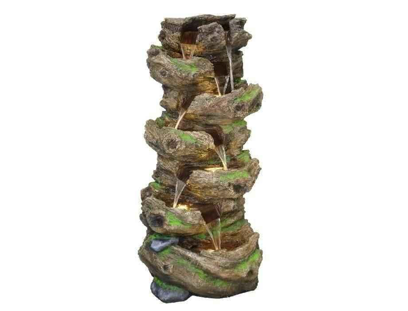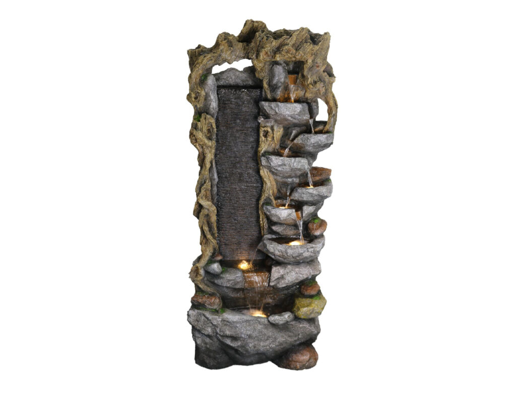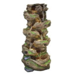 Water flows gently from the upper section through the structure, creating a layered cascading effect that adds visual depth and movement. This flowing action produces a soft, consistent sound that enhances the atmosphere, contributing to a calm and inviting outdoor environment. In both residential and light commercial settings, this acoustic quality plays an important role in creating a more relaxing and enjoyable space.