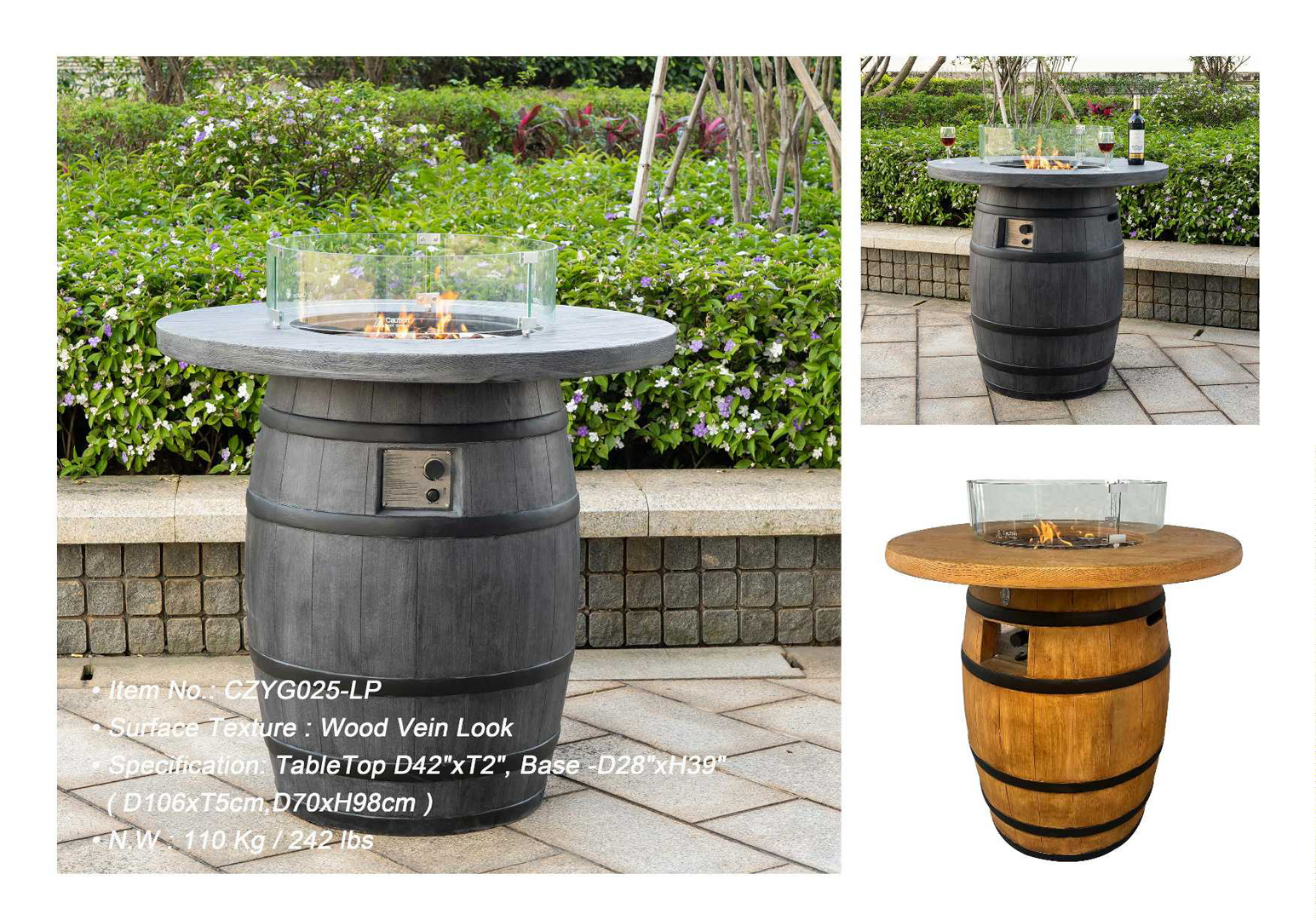 Quality and safety are paramount in outdoor furniture, and this fire pit delivers on both fronts. Weighing in at a substantial 110kg, this is a heavy-duty unit that offers incredible stability. You won’t have to worry about it shifting or tipping on a windy day, making it a safe choice for open patios, balconies, or coastal properties. For a clean and professional look, the gas tank is kept external, which allows the barrel base to maintain its perfectly rounded, authentic shape without the need for a bulky internal door. You can easily connect a standard LPG bottle and tuck it away behind a decorative cover or nearby furniture. For those who want a permanent heating solution, the unit is also compatible with Natural Gas (with professional installation), providing an endless fuel supply for the ultimate entertainer. Whether you are upgrading a suburban backyard or a commercial courtyard, this Rustic Wine Barrel Fire Pit Table is the definitive choice for style, warmth, and durability.